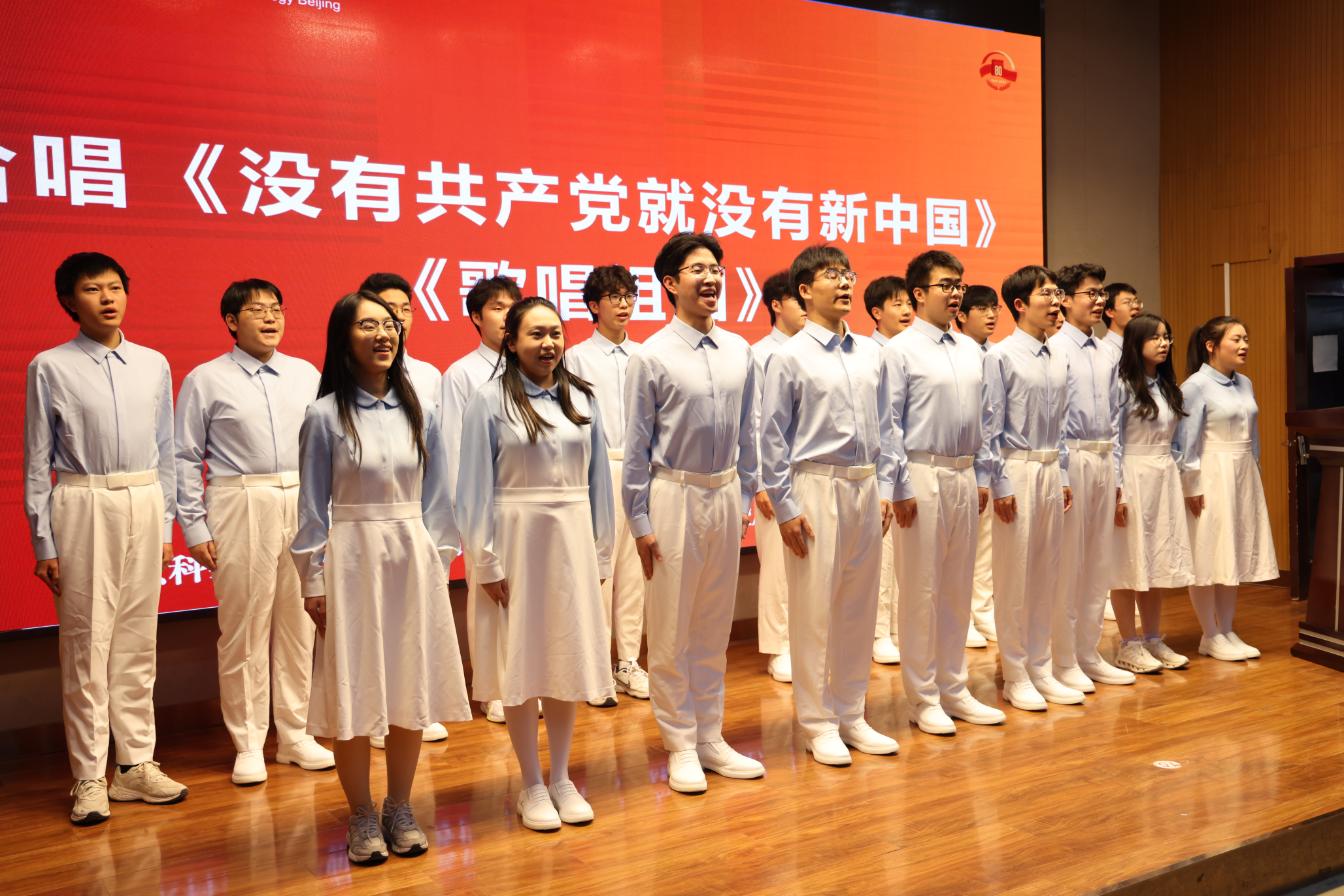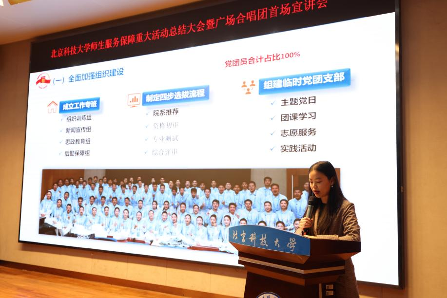 10月27日晚,纪念中国人民抗日战争暨世界反法西斯战争胜利80周年北京科技大学广场合唱团总结大会暨“青蜂宣讲团‘九三广场合唱团’”首场宣讲会在时代凌宇报告厅举行。校团委书记王海波、学生工作部副部长刘震、校团委副书记刘璐、校团委组织部部长李响、各学院团委书记等领导老师出席活动,与广场合唱团成员、宣讲团代表、青马工程学员、入团积极分子等学生代表共同参加本次活动。仪式由校团委青年文体活动指导中心常务副主任石卓娜主持。