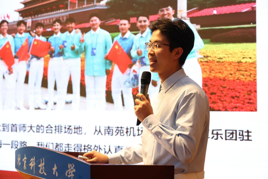 随后六位来自不同学院的宣讲团师生代表以青春的视角解读历史,以真实的感悟传递精神,展开了一场跨越八十年的青春对话。资安学院辅导员王宗贤以《从“33E01”到“01W10”,身份转变,底色不变!》为题,分享了从学子到教师的成长历程,诠释了北科人忠诚教育、初心不改的坚定信仰。学生丁岚在《用青春之声守护盛世安宁》中,讲述了她在合唱排练中深刻体会到的青年责任与时代担当。能环学院学生王秉玺以《不穿军装的战士》为题,阐释了新时代青年虽未身着戎装,却同样以坚守与奉献守护家国的深刻内涵。冶金学院学生温俊辉在《以青春正步,响报国强音》中,分享了他在合唱训练中迈出的坚定步伐,以及将个人成长融入强国征程的深切体会。文法学院学生钟月以《反法80,广场有我,还有他们……》为题,深情讲述了团队协作中的温暖瞬间与集体力量,展现了精神传承中的“我们”维度。高工学院学生李端瑾则以《记忆深处的闪光——我的阅兵记忆拼图》为题,通过个人珍贵的“阅兵记忆”,拼接出历史厚重与青春明亮的时代画卷,感人至深。
