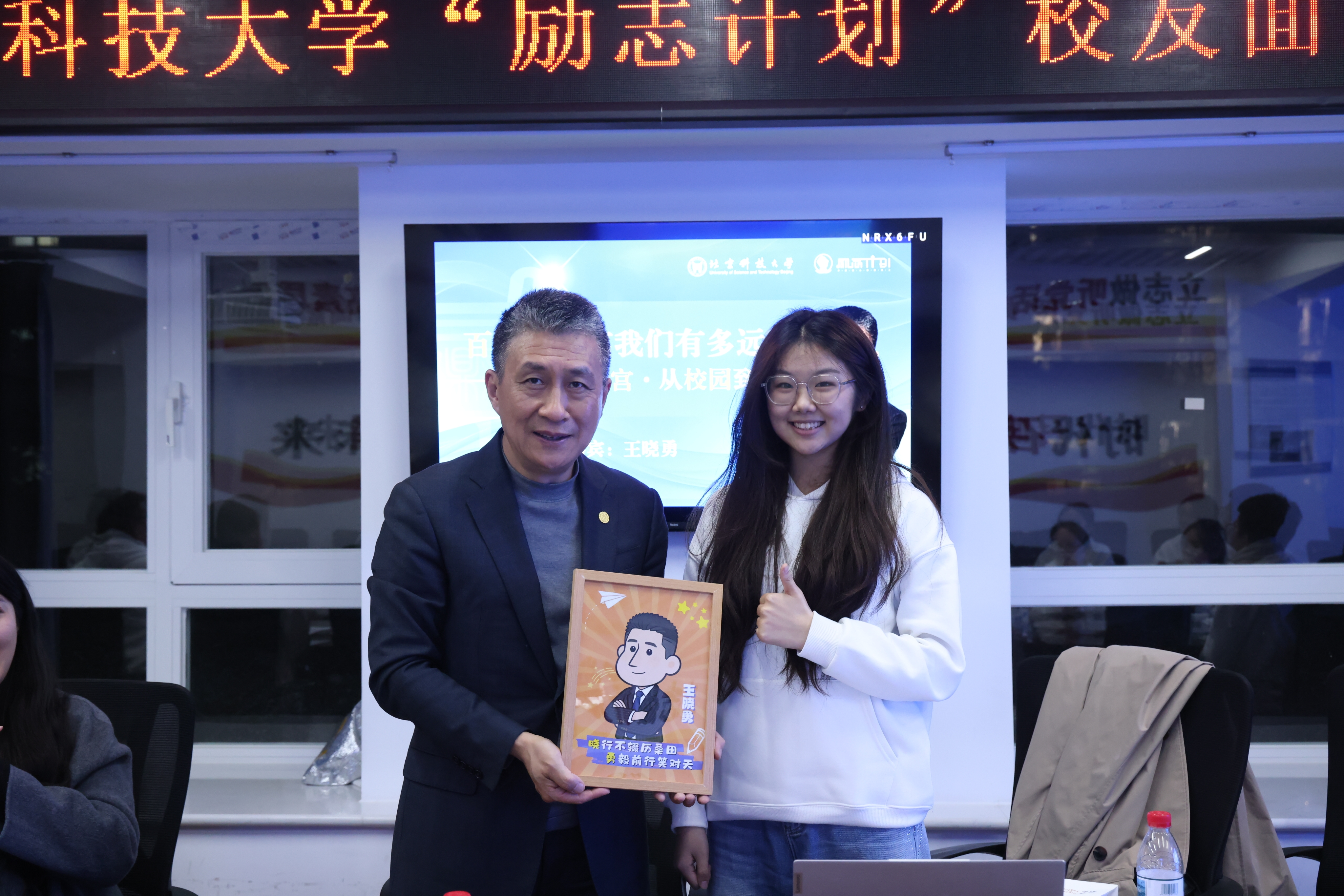 活动最后,学员代表刘晓墨向王晓勇学长送上纪念礼物,感谢学长在百忙之中回到母校,为学员们带来一场思想与实践交融的精彩分享。这份礼物承载着学弟学妹们最诚挚的敬意与祝福,也象征着校友情谊的联结与传承。