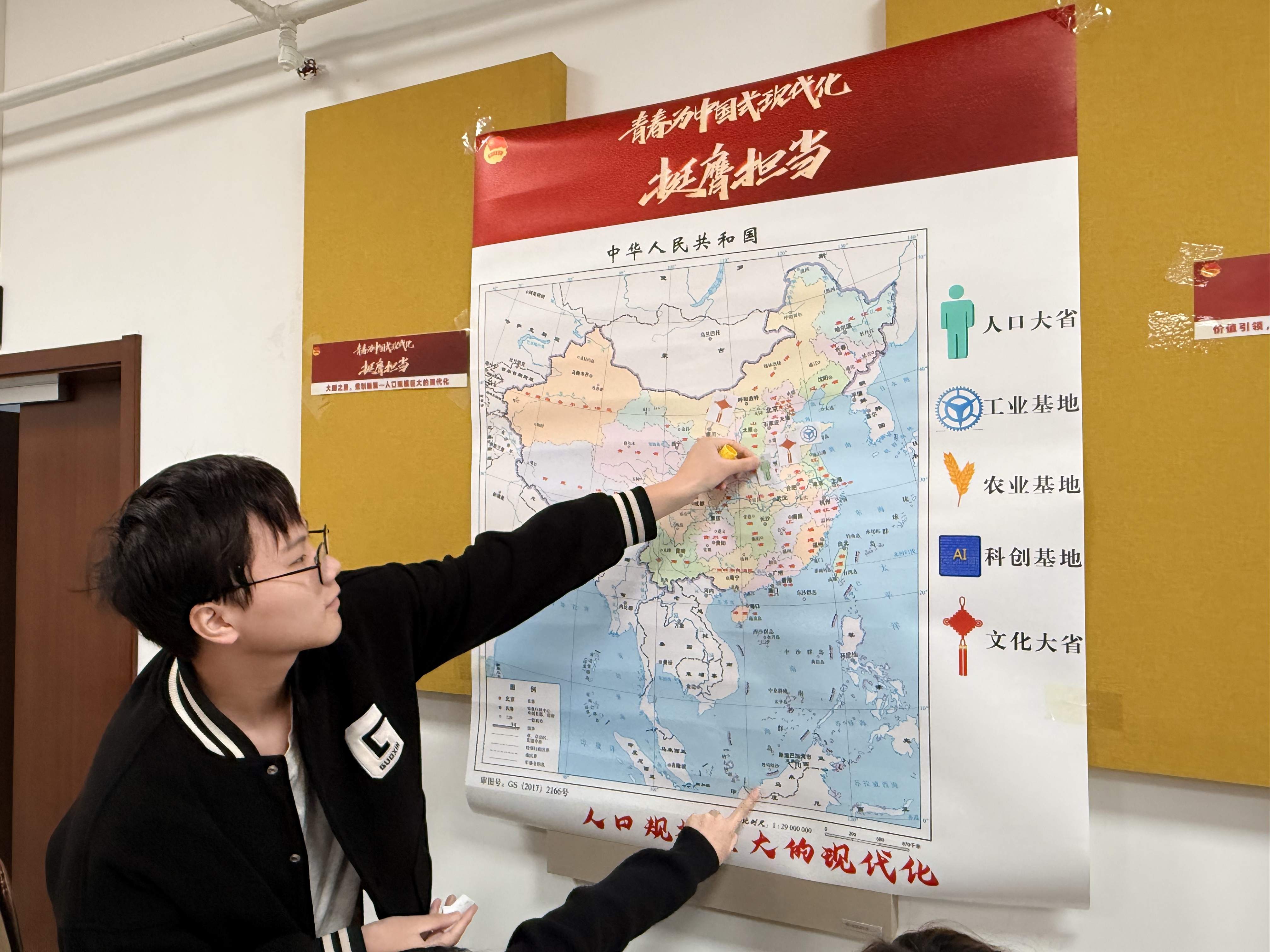 展区设置互动地图和心声墙,引导同学们标注省份特色、书写家乡特色文化,并结合体验感悟留下对人口规模巨大现代化的理解与青春誓言。