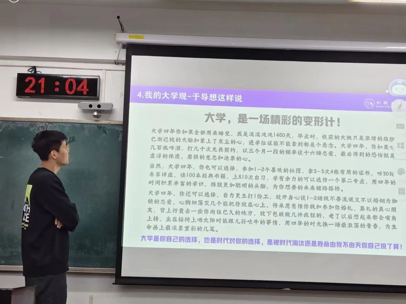 于导真诚地为同学们分享了他自己的大学生活,让同学们看到于导成功的背后也有很多挫折与不易。用自己的亲身经历回答了“大学应该怎么度过”之问。于导又从大学的选择,专业分流和未来选择几个方面为同学们分享了许多“干货”, 真挚分享让同学们看到“优秀”背后的真实纹理,同学们收益匪浅。