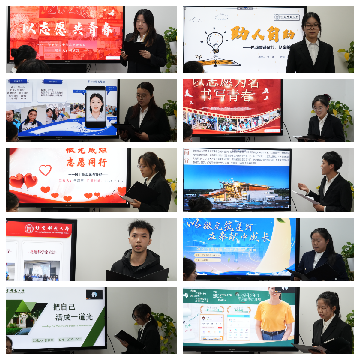 答辩会上,11位候选人依次上台,结合精心准备的PPT,从志愿服务经历、心得体会、个人成长与未来展望等多个维度,全面展示了他们的志愿风采。他们中有的长期扎根社区,为老年人提供智能技术辅导;有的活跃在大型赛事活动现场,以专业的服务保障赛事运行;有的则利用课余时间,持续参与支教助学、环境保护等公益项目。一桩桩感人的事迹,一串串沉甸甸的服务时长,不仅体现了智科学子服务社会、甘于奉献的高尚情操,也展现了新时代青年强烈的社会责任感和担当精神。