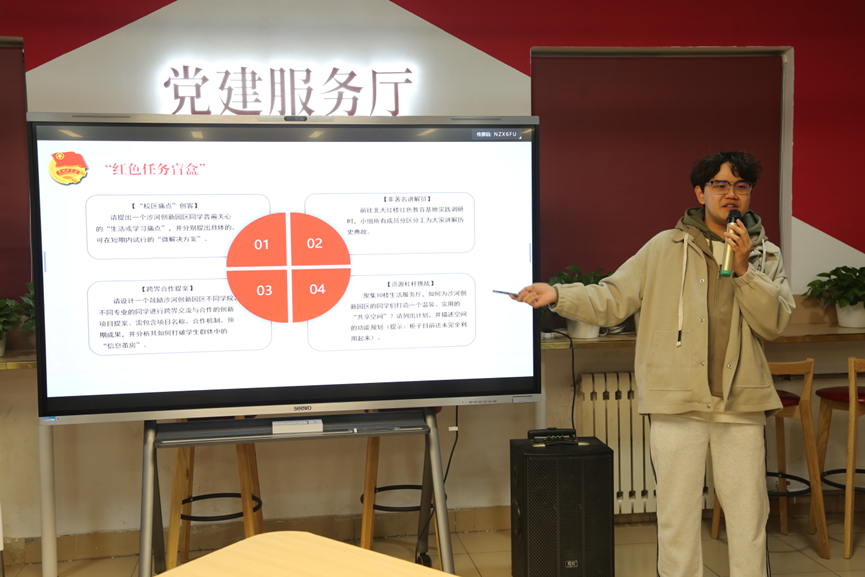 最后是“红色任务盲盒”环节,各小组组长抽取本次团校专属任务,内容涵盖跨学院合作提案、红色基地讲解、生活服务厅“共享”空间规划等项目。