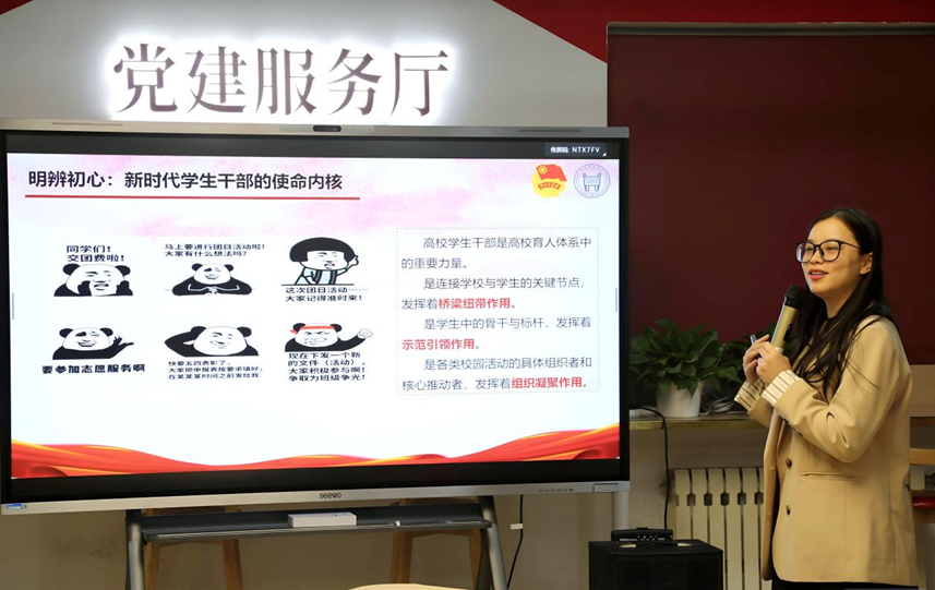 刘璐以“熔铸钢铁脊梁,挺膺时代担当——新时代学生干部的使命与行动”为主题开展宣讲。宣讲围绕“明辨初心、锤炼本领、躬身践行”三大板块展开,结合习近平总书记关于青年工作的重要思想及给我校师生的两封重要回信精神,阐释了新时代学生干部作为桥梁纽带、示范标杆和组织核心的使命内核。