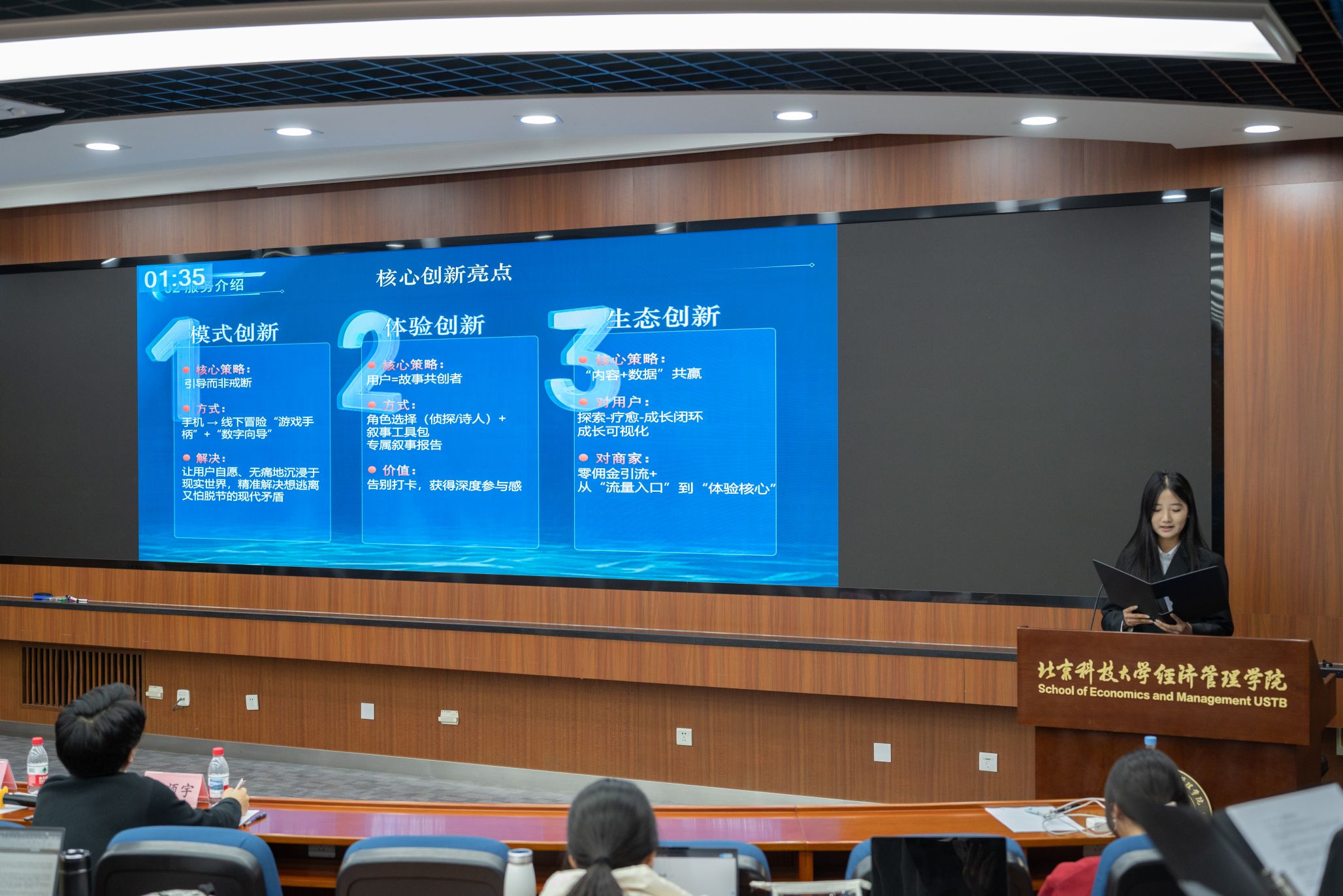 答辩环节中,各参赛团队按照抽签顺序依次登台展示。每支队伍仅有3分钟的展示时间,选手们争分夺秒,以清晰的逻辑、生动的表达,全面呈现项目核心内容。这些创意项目紧扣生活实际与学科前沿,从非遗文化传承、乡村振兴助力、数字经济创新到绿色可持续发展等多个领域挖掘灵感,展现了经管学子广阔的视野和强烈的社会责任感。