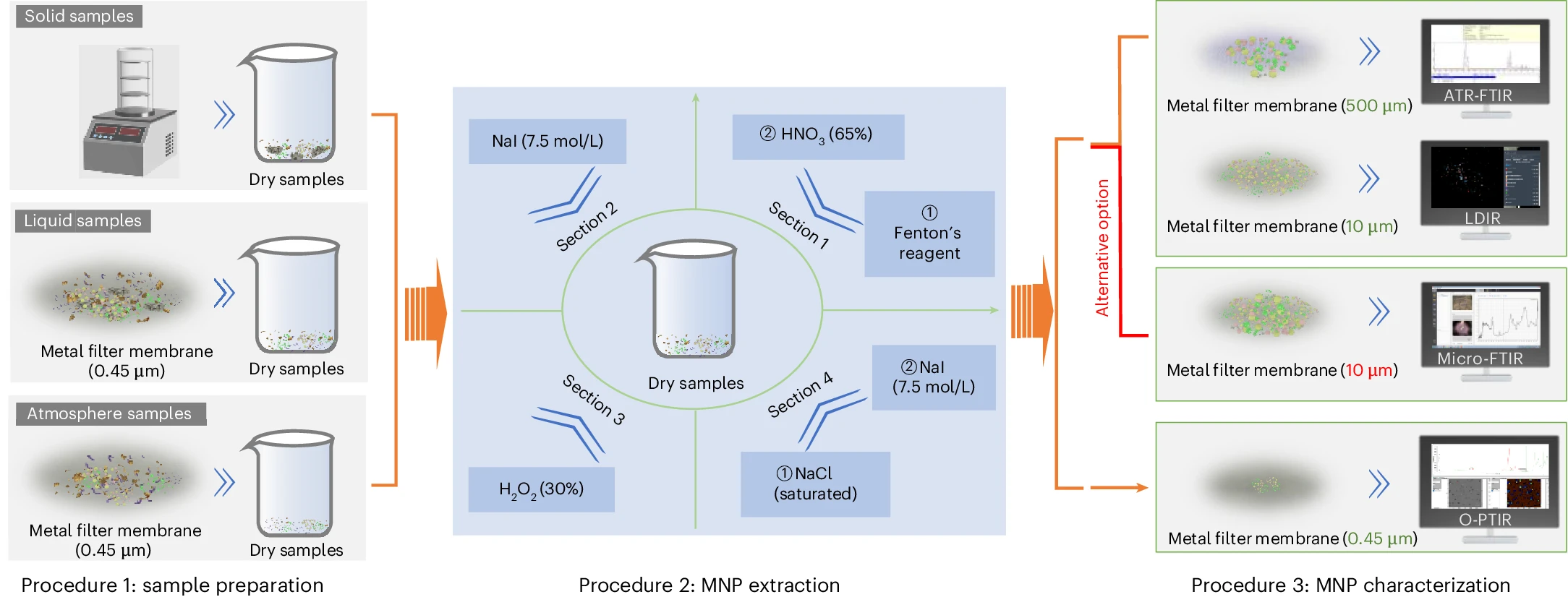 面对这样的现状,最根本的原因在于微纳塑料研究仍缺乏一套跨实验室都能稳定复现的统一工作流程。因此,我们建立了一套能够灵活组合、适用于不同环境基质、并覆盖0.5-5000 µm全粒径范围的微纳塑料标准化分析流程。其内容包括不同环境样本的预处理步骤,由前消解、前密度分离、后消解和后密度分离组成的四步提取法(FSEM)以及利用ATR-FTIR、LDIR和O-PTIR三种光谱技术联用实现的多尺度表征。