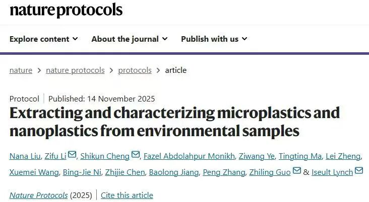 近日,我院李子富教授团队在Nature Protocols上发表了题为“Extracting and characterizing microplastics and nanoplastics from environmental samples”的论文。该工作允许研究人员确定不同环境基质中微纳塑料(MNPs)的赋存特征并且能够检测低至500 nm的纳米塑料。该流程由三个程序(样品预处理、MNPs提取、MNPs表征) 组成并结合多种适用技术实现了微纳塑料的特征分析,这为全球微纳塑料研究提供了可复现、可对比、跨技术平台可衔接的标准化方法学基础,对环境监测、污染评估和国际标准制定具有重要意义。能环学院博士研究生刘娜娜为论文第一作者,北京科技大学李子富教授、程世昆教授及英国伯明翰大学郭志灵助理教授、Iseult Lynch教授为通讯作者。