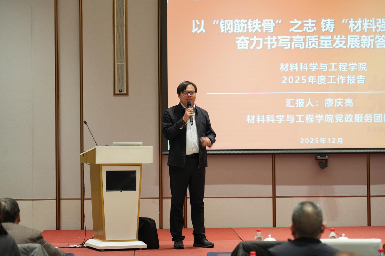廖庆亮作学院2025年度工作汇报。他围绕党建工作、学科发展、学生培养、科研创新、管理服务等方面全面总结了学院过去一年的工作和成果。他指出学院发展的每一步都凝聚着全体师生的智慧与汗水,期望新的一年,全体师生以初心为舵,以奋斗为帆,奋力书写高质量发展新答卷。