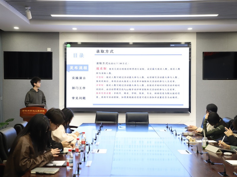 本次会议围绕活动发布全流程展开,系统讲解了从活动创建到审核的完整操作步骤。同时,会议介绍了部门主体工作及审核流程,并针对日常运行中的频发问题进行了集中答疑。材料学院团委青年成长服务中心办公室指导老师陈梦馨、材料学院本科25级辅导员范名凯、蒋婧出席本次活动。本次会议由盘通主持。