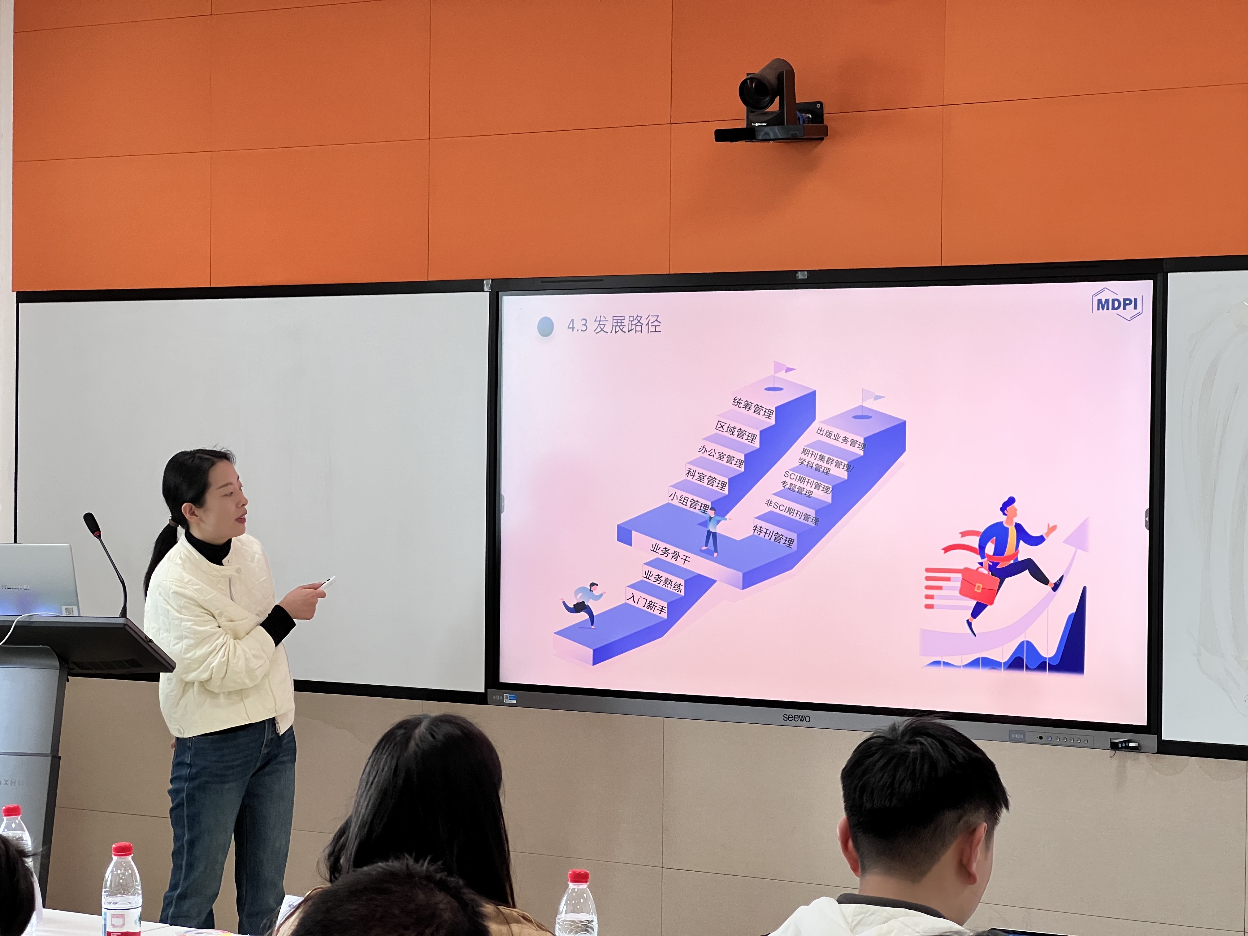 讲座结束后,曼迪匹艾海淀办公室海洋科组长闫旭丽开展期刊介绍与招聘宣讲。她简要介绍了曼迪匹艾的发展历程、全球布局及旗下期刊特色,重点推介了与能源、环境领域相关的期刊资源,同时详细讲解了公司招聘岗位、任职要求、薪资福利及职业发展路径,为有求职意向的学生提供了精准的就业指导。