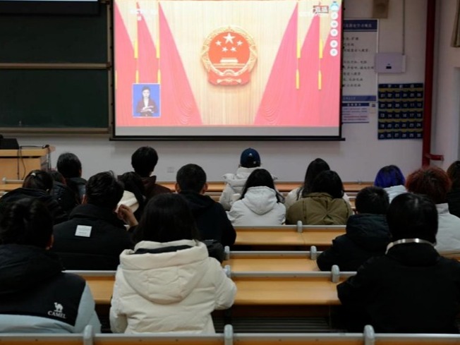 为深入学习贯彻全国两会精神,3月5日上午,未来城市学院组织学院师生干部于逸夫楼705教室集中观看第十四届全国人民代表大会第四次会议开幕式直播。各年级学生骨干参与本次活动。