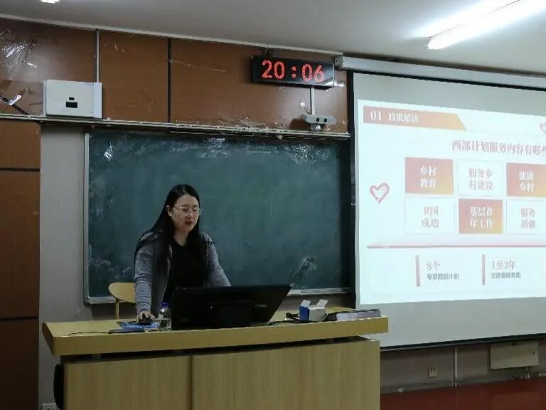 在西部计划宣讲中,王昕冉从项目背景、服务内容等方面展开介绍,深入解读西部计划对个人发展的积极意义,鼓励同学们主动投身西部建设,在基层实践中锤炼自身、绽放青春价值。
