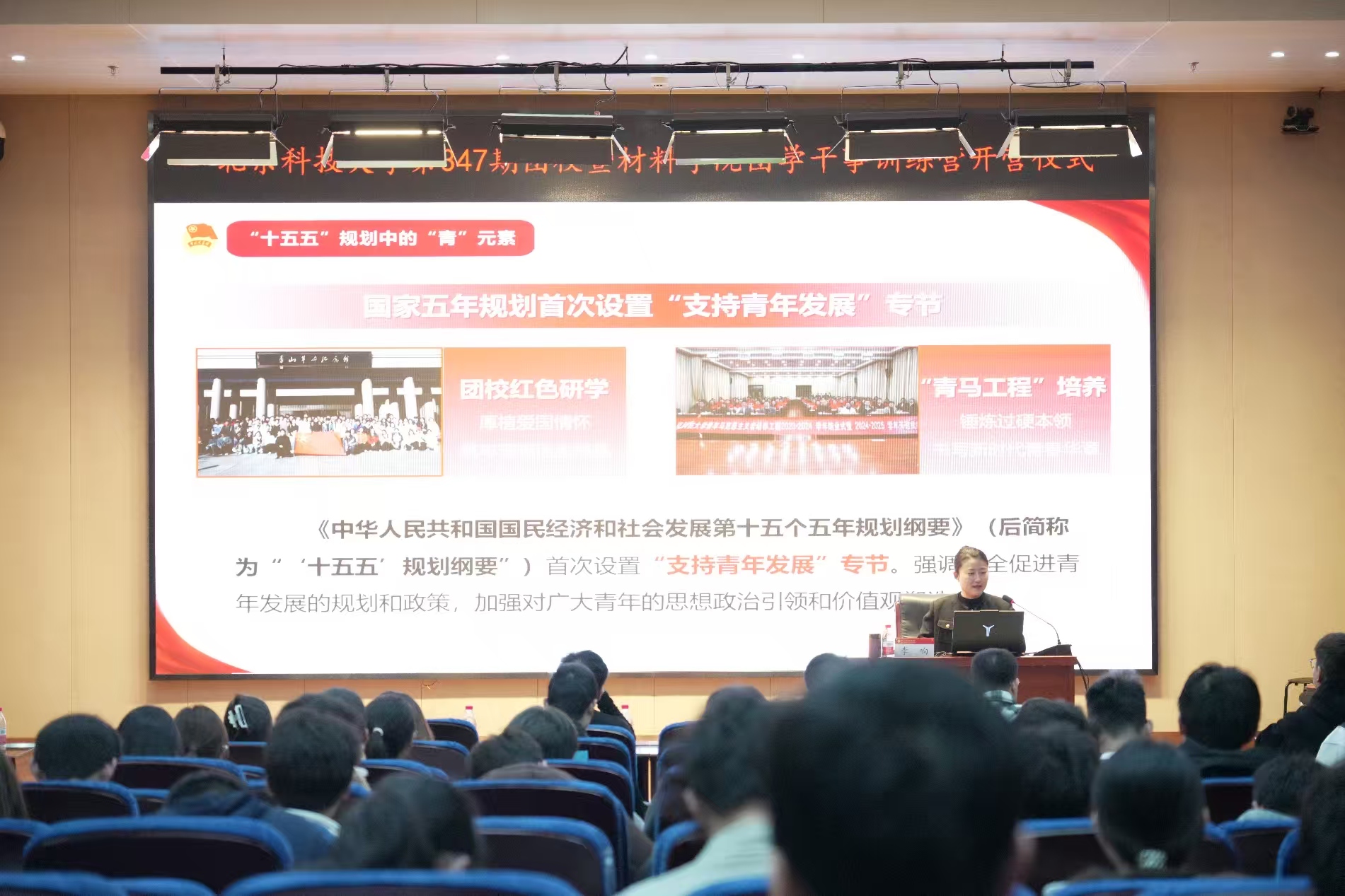 开幕式结束后,北京科技大学第347期团校第一讲正式开讲。李响老师以“不做时代过客 争当青年先锋”为主题进行专题授课,围绕《“十五五”规划纲要》深入剖析国家发展中的青年机遇,从青年科技人才培育、青少年交流促进、理想信念教育强化、青少年健康保障完善、群团服务优化等维度,为团学干部解读国家发展的“青春密码”;同时结合我校钢铁精神和习近平总书记对青年的殷切期望,引导全体学员继承红色传统、弘扬钢铁品格,将个人理想融入国家发展大局。