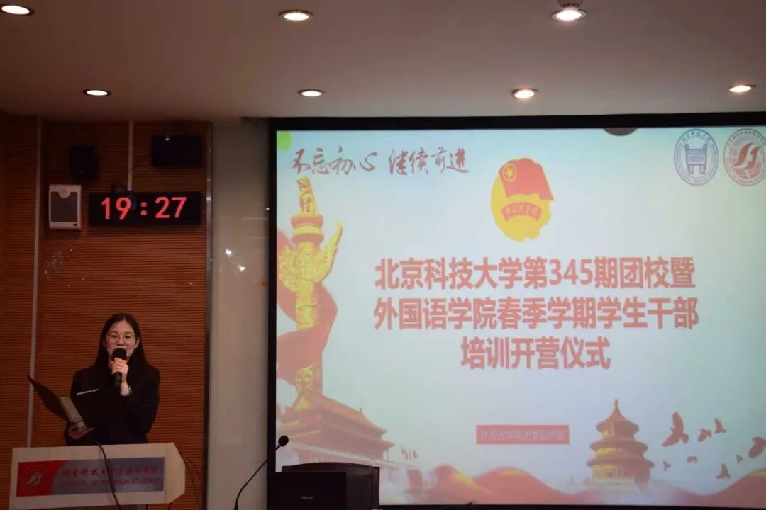 2026年3月26日,北京科技大学第345期团校暨外国语学院2025-2026学年春季学期学生干部培训开营仪式于外语楼304举行。校团委组织部部长李响,学院团委副书记(主持工作)李进,本科2025级辅导员邱越,研究生2025级辅导员谭泉参与此次活动,各班班委、团学骨干及入团积极分子参会学习,活动由马嘉悦主持。