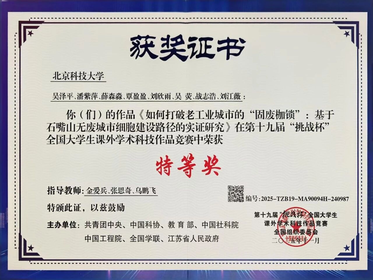 2025年以团队负责人为法人孵化成立北京北科益安新材料科技有限公司,积极布局循环经济;斩获第十九届大挑主体赛全国特等奖,参编《矿山修复回填用钢渣应用技术规范》、《超细复合矿物掺合料分级与应用技术规范》等多项国家与行业标准,核心技术广泛应用于矿山充填、绿色建材等领域。