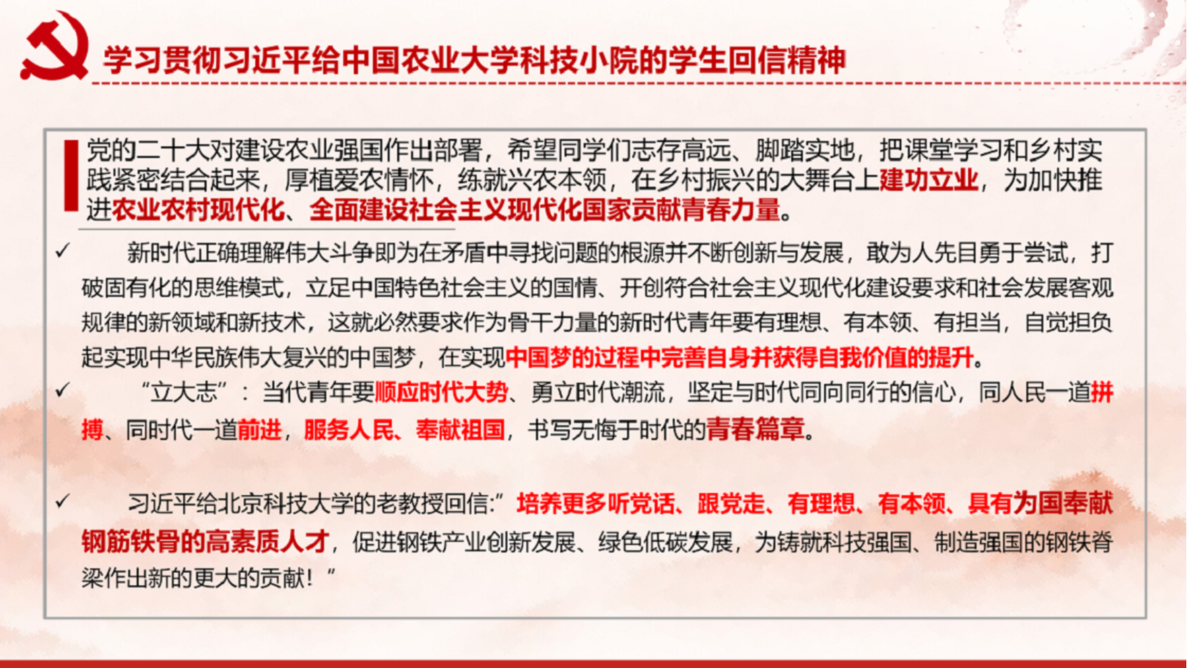 张邱胤哲同学首先带领同学们细致梳理了习近平总书记在历年五四青年节前后发表的系列重要讲话,随后从乡土中国、实事求是、联系群众、立志兴农、建功立业几个角度着手,深入解读了总书记回信精神,并在习近平总书记给我校老教授回信一周年之际,带领同学们重温了习近平总书记给我校老教授的回信精神,结合两封回信精神勉励同学们在全面建设社会主义现代化国家的新征程中奋发作为、建功立业!