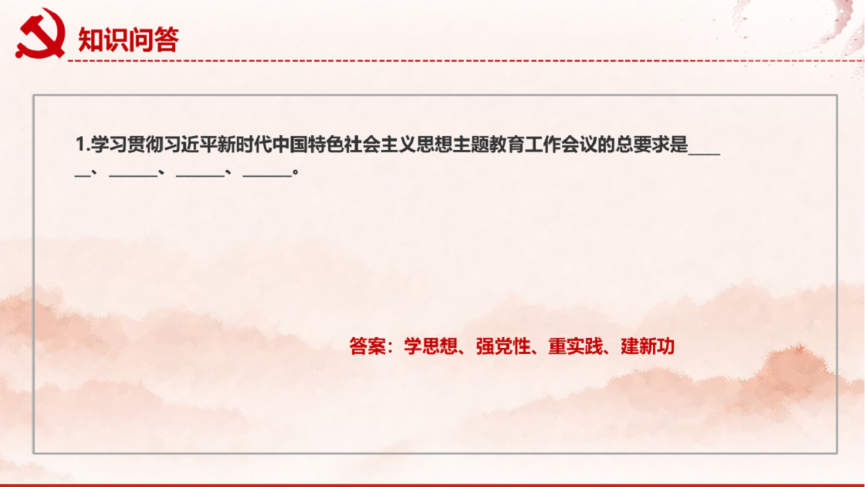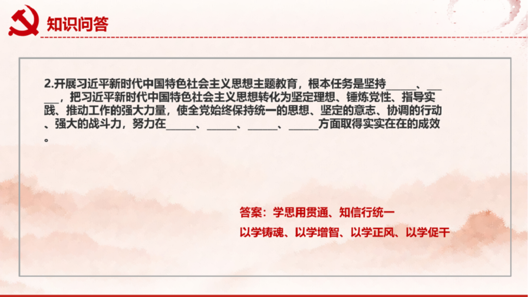 李猛同学选取主题教育总要求、根本任务,以及总书记系列重要讲话中的重点内容设置了问答题目,帮助同学们梳理和回顾所学内容,同学们踊跃回答,积极参与。