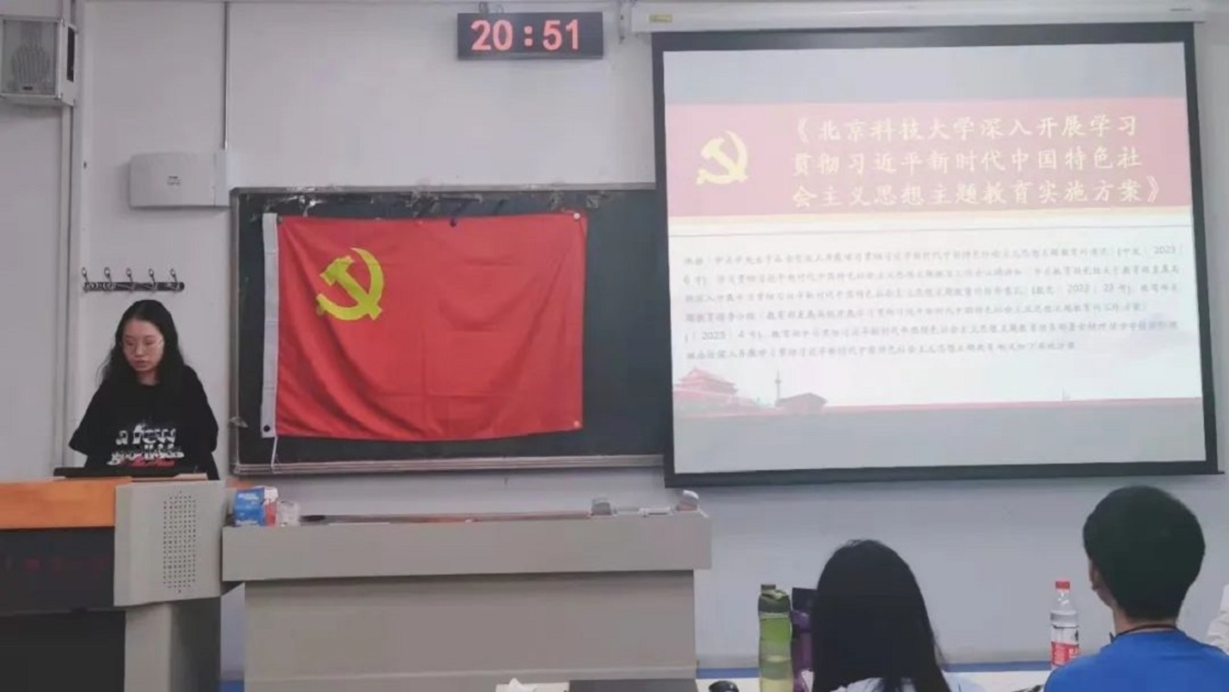 会议第三项,由杨静同学带领支部党员学习《北京科技大学深入开展学习贯彻习近平新时代中国特色社会主义思想主题教育实施方案》。