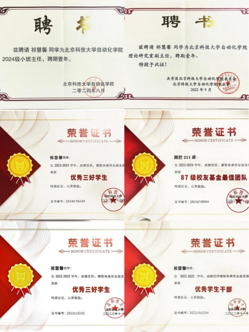 祁慧馨,自动化学院2021级测控211班本科生,中共党员,大三学年加权成绩93.85,排名1/52。曾获国家奖学金、美国大学生数学建模比赛M奖、第十五届全国大学生数学竞赛二等奖、第十八届“西门子杯”中国智能制造挑战赛华北赛区二等奖、北京市第三十四届大学生数学竞赛二等奖等奖项,自动化学院“院长奖章”获得者。现担任专业班测控211班团支书,自2401班小班主任,曾担任行政班自2101班团支书、自动化学院团委理论研究室副部长等。
