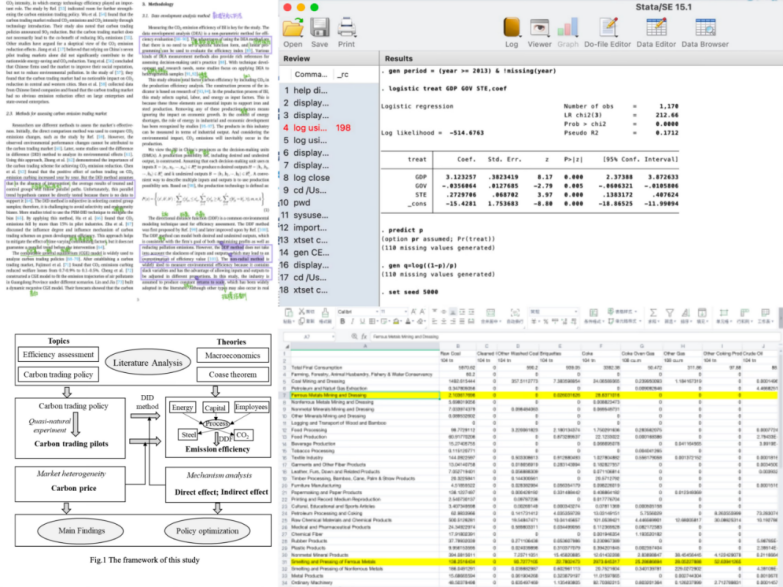 俞新宁在大二上学期便本着对科研的敬畏与憧憬向导师提出申请,希望加入科研工作。她曾参与过“智慧城市建设对建筑业生产率的影响”研究,在其中以三作的身份参与论文撰写。之后俞新宁又参与到了“碳交易对我国钢铁行业碳排放效率的影响机制”研究,在其中进行了数据收集和整理,应用Excel、Stata、MATLAB软件对数据进行处理、分析与可视化,运用非参数的生产前沿分析模型测算碳排放效率,并通过多时点双重差分模型验证了碳排放权交易政策对碳排放效率的提升作用。最终,在导师的指导下独立撰写全英论文,向SCI期刊进行投稿。俞新宁还以该课题为基础,担任团队负责人,带队参加了SRTP,获得校级立项。