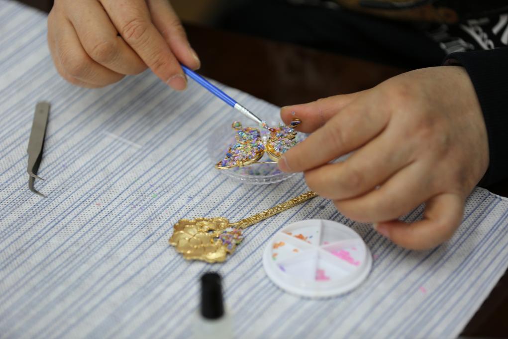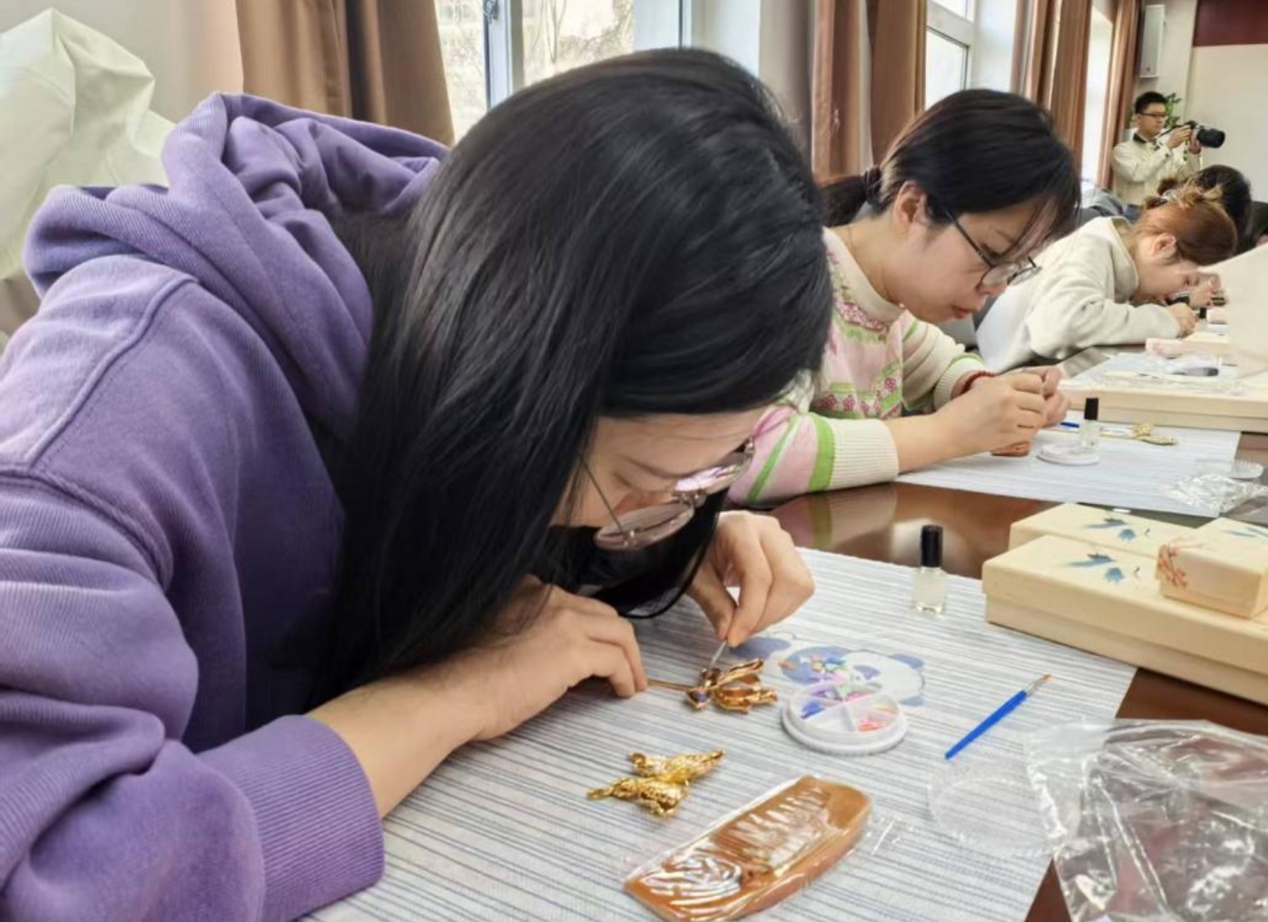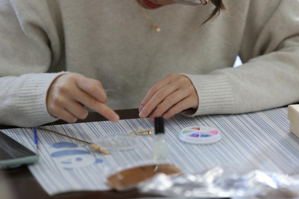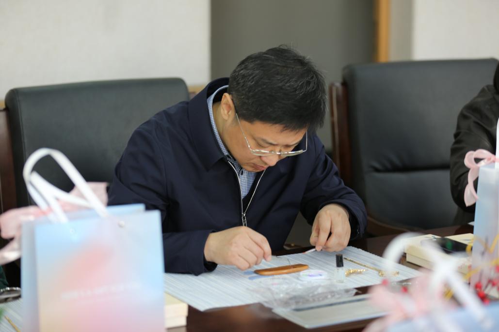 活动中,学院教职工手持贝片,通过精心打磨和巧妙镶嵌,制作出寓意“芳华永驻”的发簪、“梳写春秋”的木梳以及“胸有锦绣”的胸针。现场气氛轻松愉悦,充分展现了学院教职工“宽容和谐,研究学习”的精神风貌。参与活动的女教师纷纷表示,闪耀的螺钿与金属发簪的坚韧相映成趣,正如北科大“求实鼎新”的校训,传统文化与现代科技的融合让我们更深刻地理解了非遗文化传承的意义,生动践行了习近平总书记“让中华文化展现出永久魅力和时代风采”的号召。